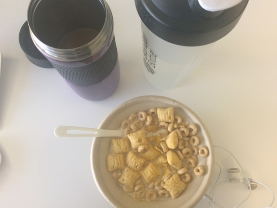 I wasn’t very hungry when I woke up this morning, so I decided to put off breakfast until I got to work. After my hour commute on the bus, I was happy to find this in the office kitchen. Cereal (always a mix of a few different types) and milk with coffee. And water, of course – I always keep this bottle with me, and fill it up multiple times throughout the day.