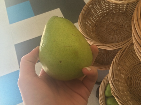 That bowl of cereal was as small as it looked. By mid-morning I was hungry again, so I grabbed a pear. It was a bit under-ripe, but still tasted yummy.