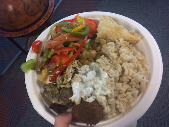 I had a meeting during lunch, so grabbed this plate before heading into the conference room. The office serves hot lunch every day – lucky me! Today was Middle Eastern. I had some chicken, rice, tzatziki, veggies, and a sweet phyllo square for dessert. It was all delicious. I didn’t eat the falafel you see on my plate because it was a little dense and bland.