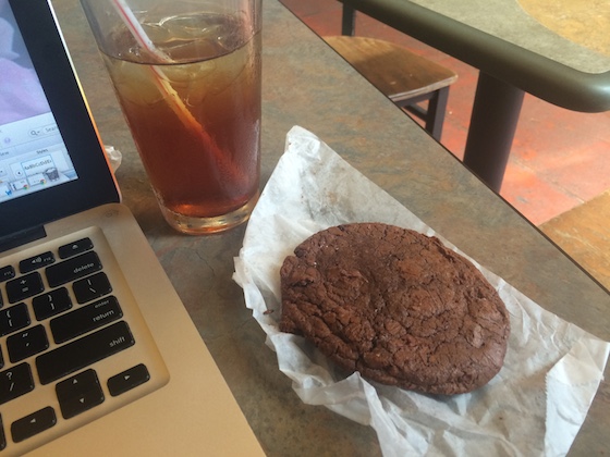 After lunch I headed to a local coffee shop. I sipped iced tea and worked on an exciting upcoming project for the blog! I also picked up a double chocolate cookie from The Cheeseboard, and nibbled it after about two hours of work.
