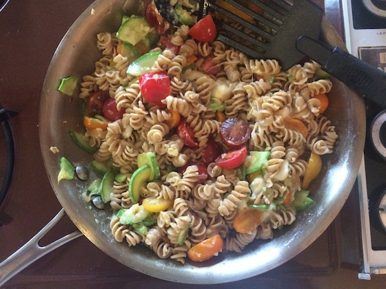 For dinner, I threw together a vegetarian carbonara from what was left in the fridge – it’s getting to be time for grocery shopping! I sautéed shallots and zucchini in olive oil, then added whole wheat fusilli, halved cherry tomatoes, an egg, diced mozzarella balls, and a sprinkling of parmesan. I tossed it all together until the cheese melted and the egg formed a nice, smooth sauce. Absolutely delicious! As you can see, there were plenty of leftovers.