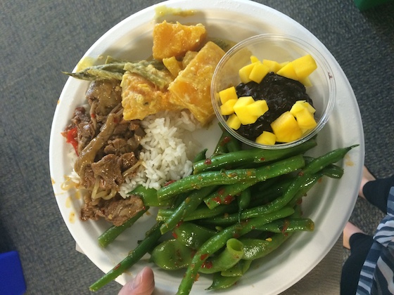 My day was super busy working on a project with one of my team members – our deadline is Friday! lunch came before I knew it: Thai curry with butternut squash and a little beef, steamed rice, lotsa green beans, and a little sticky rice with mango for dessert. I consciously took a bit of a smaller portion, because even though it looked delicious I wasn’t particularly in the mood for a big plate. This serving was perfectly yummy and satisfying.