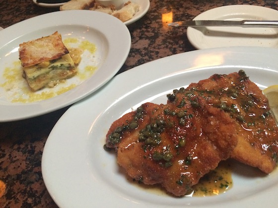 My mom was in town for work, so she and I met up for dinner. We went to an Italian restaurant that she likes, but I’d never tried. We sat at the bar – it was so fun! Our meal began with sautéed broccoli rabe, for some good green veggies. Then, we shared a delicious pork milanese and summer squash lasagna. Both were incredibly well-prepared. Look at the crust on that pork – it was so crisp and flavorful! I love to share – you get the chance to try a couple of dishes, and I find that it can often be unsatisfying to eat too much of a single dish. With sharing, I never get bored.