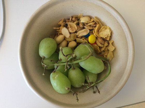 The afternoon flew by while I worked on a project. I stopped for a couple minutes for this quick snack of a bunch of green grapes and a handful of trail mix (with a little Honey Bunches thrown in for good measure).