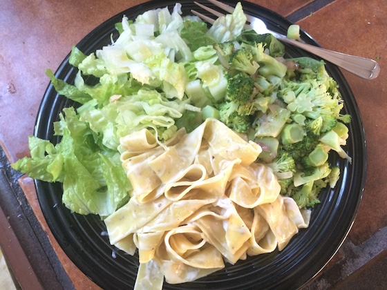 I was able to leave work a little earlier than normal, and I got to the BART station just as my train was pulling in – I love it when that happens. The walk back home through Berkeley was so pleasantly refreshing. I had plenty of time to cook a real dinner. I tossed Trader Joe’s lemon pappardelle with goat cheese and a little olive oil, cooked broccoli with sautéed shallots, and added a large salad on the side. All of it was delicious! I realized that with this plate and my salad for lunch, I certainly got my fill of greens for the day.