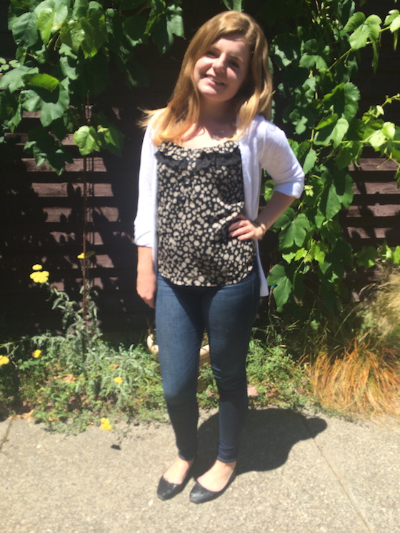 I know blue with black is sometimes considered taboo, but I actually love the combination! To me, it feels classic and sophisticated – especially with a pop of white thrown in for interest! This fun chiffon blouse (with polka dots and a few ruffles) has served me well for evenings out. I love it paired with nice dark blue skinny jeans and some black flats. With this crisp white cardigan over top, I think it also works for the office.