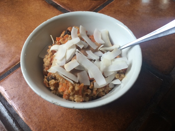 I spent most of this weekend laying low, trying to recover from a cold that began bothering me last week. I’m happy to say that I think all the sleeping and hot tea worked, because I’m feeling much better! Yesterday morning I slept in, then prepared this bowl of oats. There’s a secret ingredient in there, but I won’t spoil the surprise yet. Check back tomorrow for the recipe! I topped my oatmeal with peanut butter and these delicious roasted coconut chips from TJ’s – I highly recommend them.