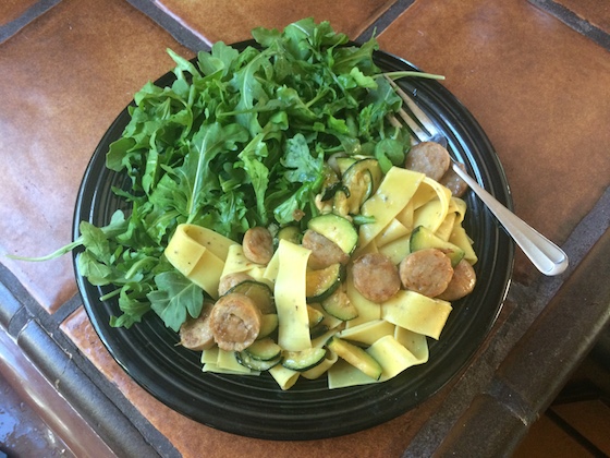 This dinner was totally delicious. I sliced up a chicken sausage, and sautéed it with zucchini. Then, I tossed it with lemon pasta, and added olive oil and fresh lemon juice. The bright lemon flavor was a nice contrast to the hearty sausage. I added lots of arugula on the side with more olive oil and lemon juice for dressing. I’m already looking forward to enjoying the leftover pasta for dinner tonight! And I finished off the night with a couple squares of dark chocolate and some more coconut chips. I’m telling you, they are addicting!