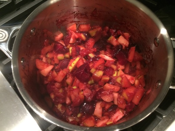 Yesterday morning started with my usual oats for breakfast. I topped them with chia seeds and hemp hearts, plus a delicious apple plum compote. My parents gave me a big bag of fruit and I wasn’t able to get through all of it, so I preserved some to freeze for later. I cut the apples into small chunks and sliced the plums, then cooked them in a saucepan with a little water, a few spoonfuls of brown sugar, some cinnamon and the juice of a lemon. It turned out delicious, like a slightly tart, bright red applesauce. I snapped a photo as I was cooking because it was just so beautiful.