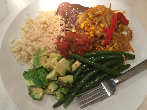 For dinner, I put together a Mexican veggie plate. Brown rice, refried beans, lots of vegetables, plus some salsa and avocado. This was perfectly warming because it’s starting to get pretty cold here in San Francisco! I’ve got lots of leftovers for the rest of the week.